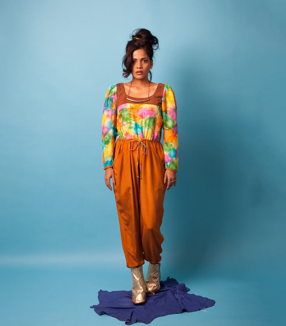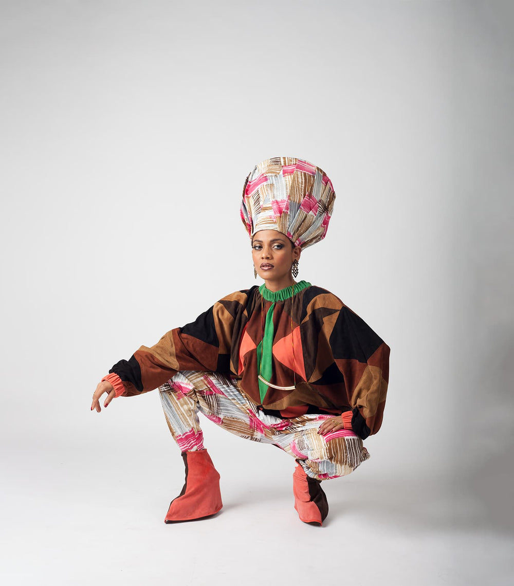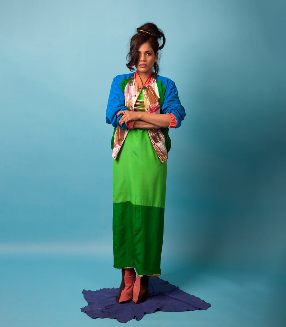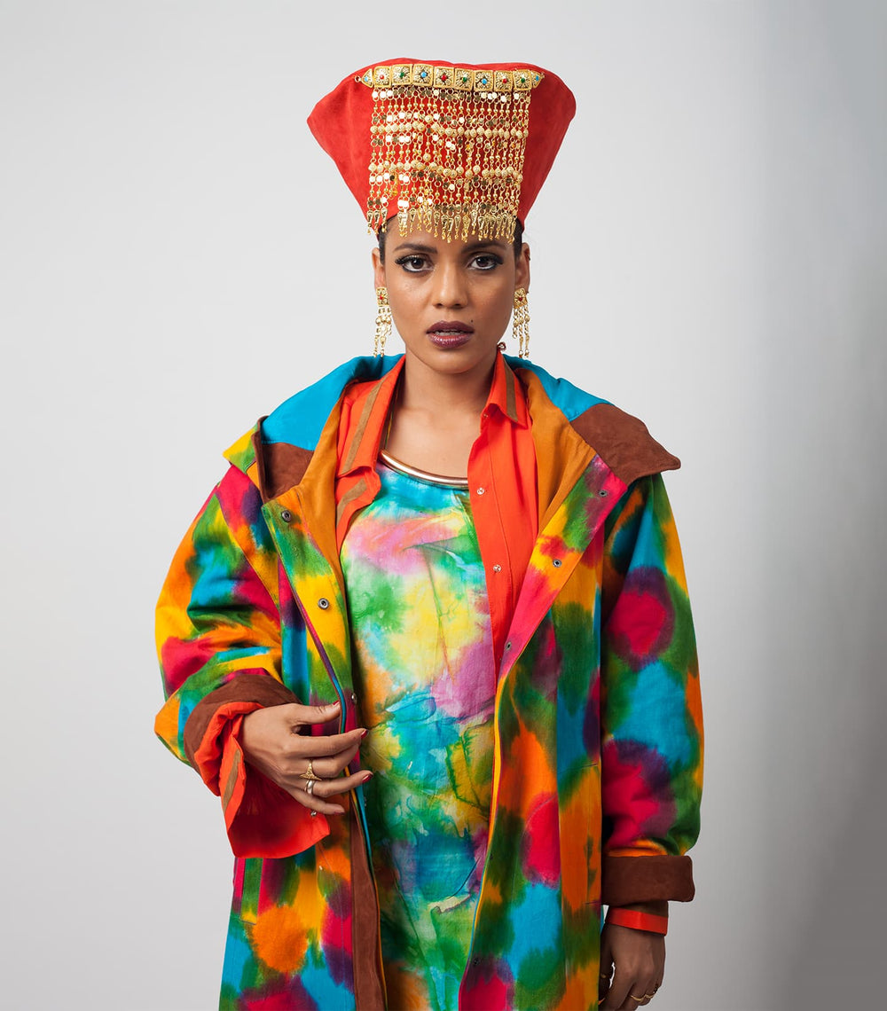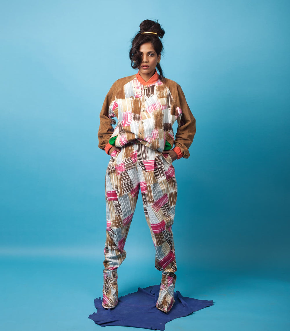 Inspired by the movie and iconic lady Don character, Madam X, played by forever queen, forever muse, forever baddest babe, forever bff (in our heads) – Rekha. Karigars from Dharavi combined suede patchwork with leather and suede with experimental dying from Kutch to bring our vision to life.
