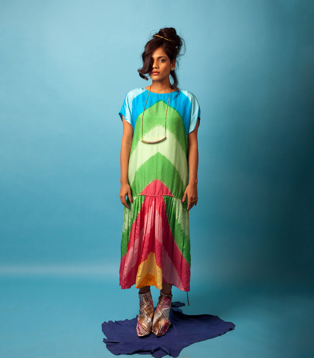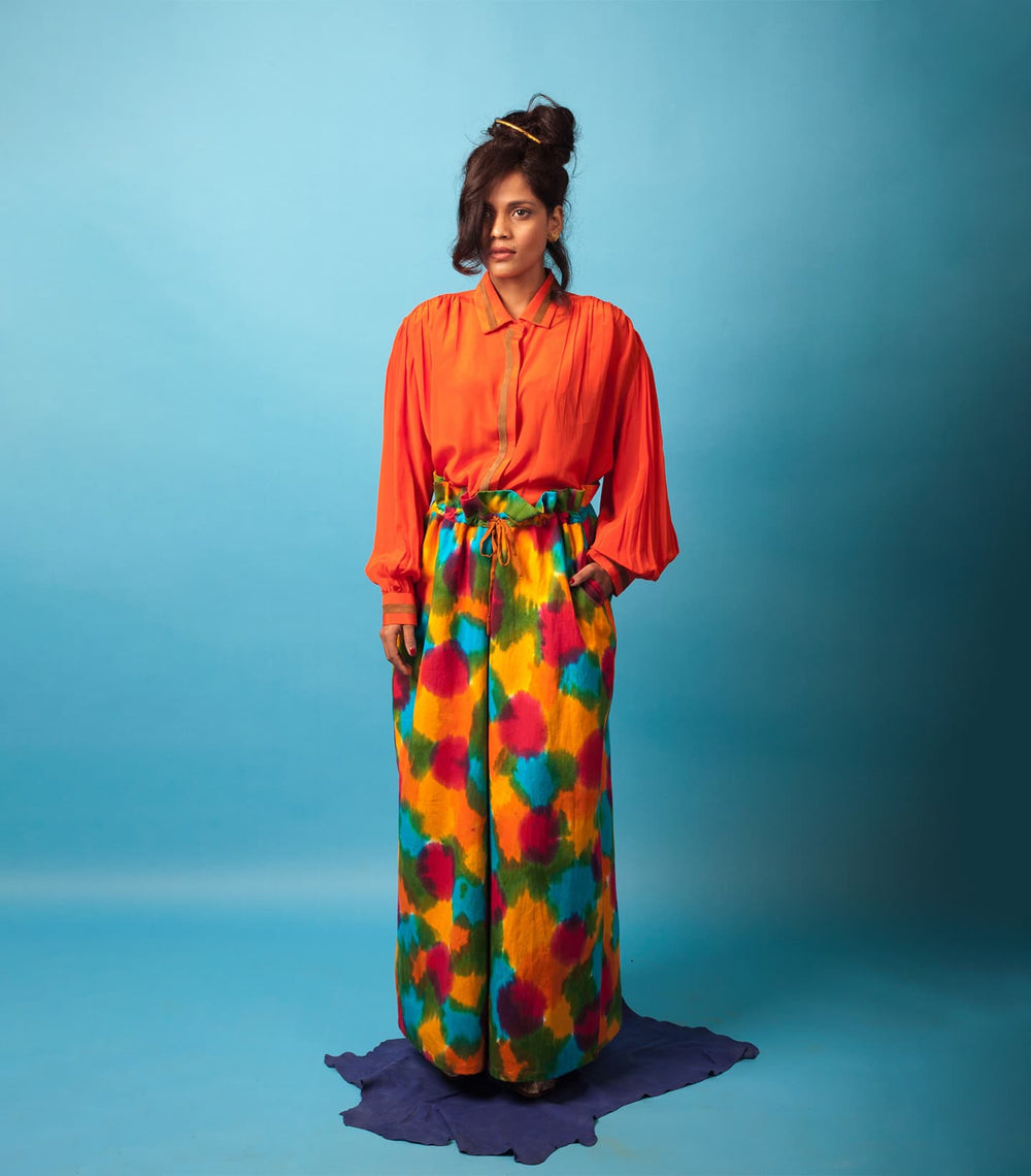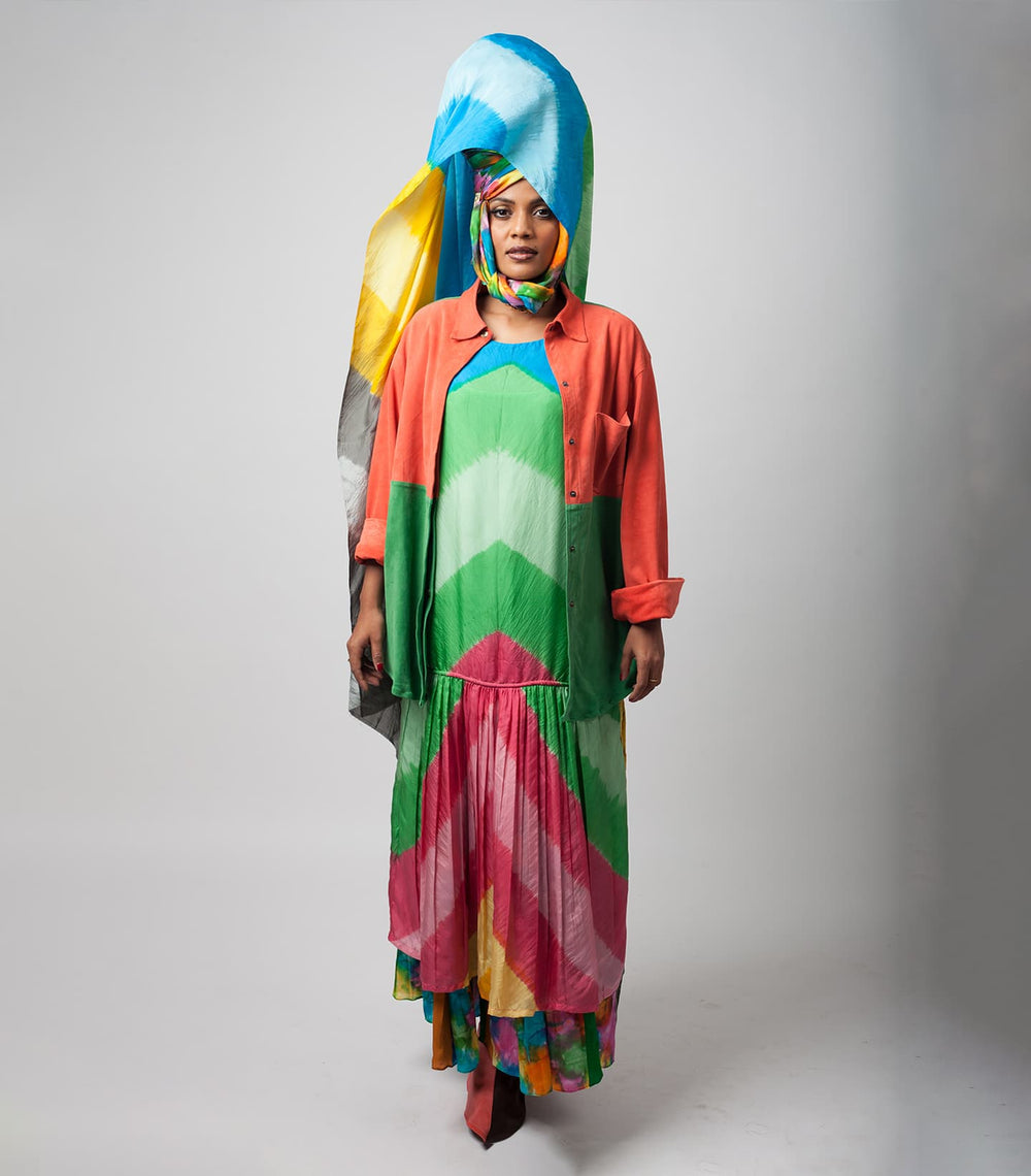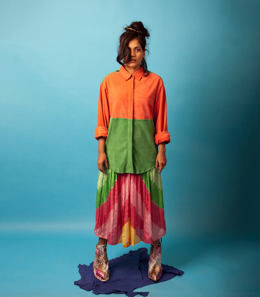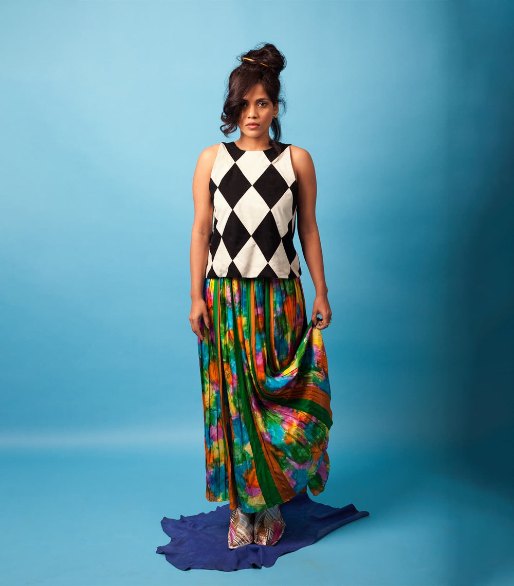 Inspired by the movie and iconic lady Don character, Madam X, played by forever queen, forever muse, forever baddest babe, forever bff (in our heads) – Rekha. Karigars from Dharavi combined suede patchwork with leather and suede with experimental dying from Kutch to bring our vision to life.